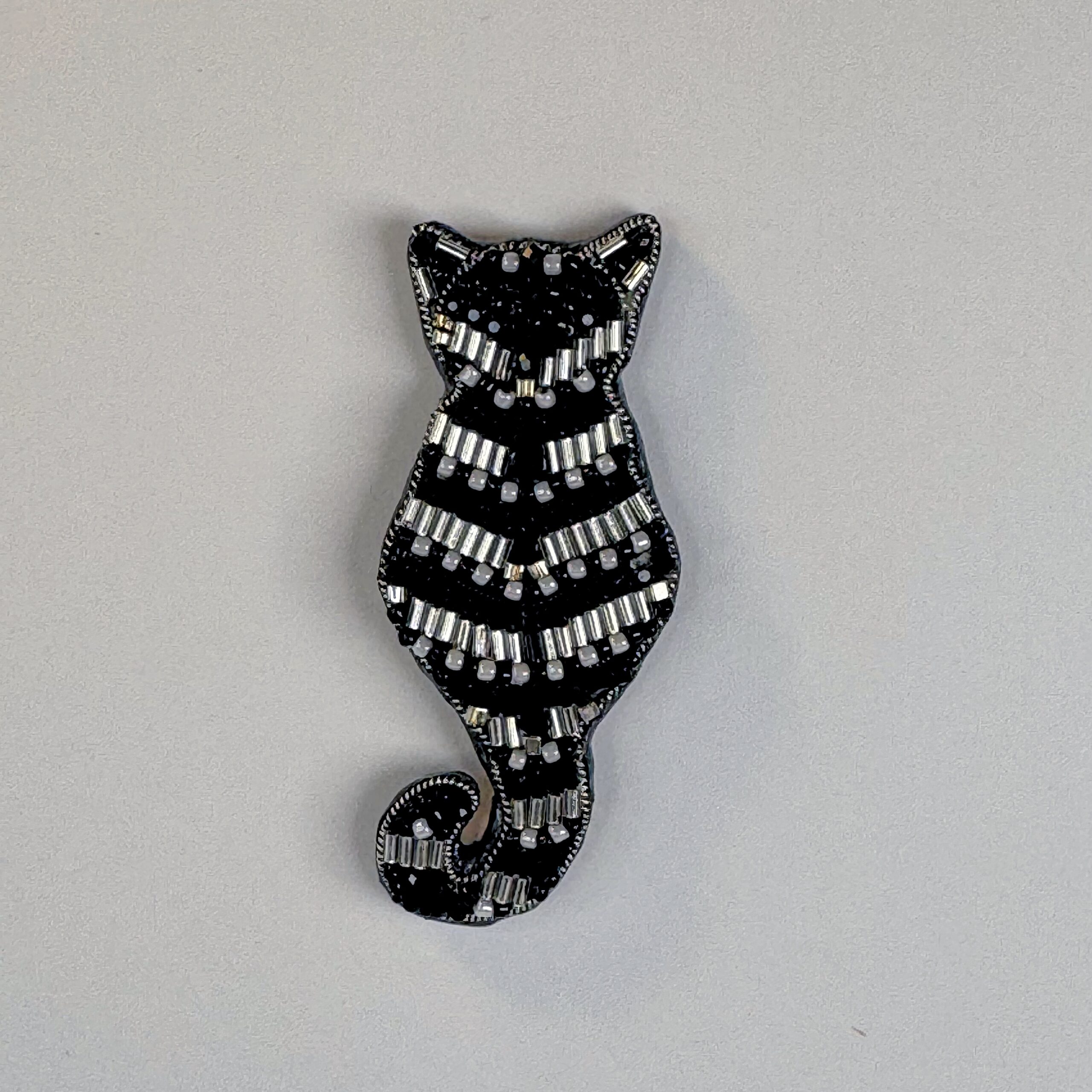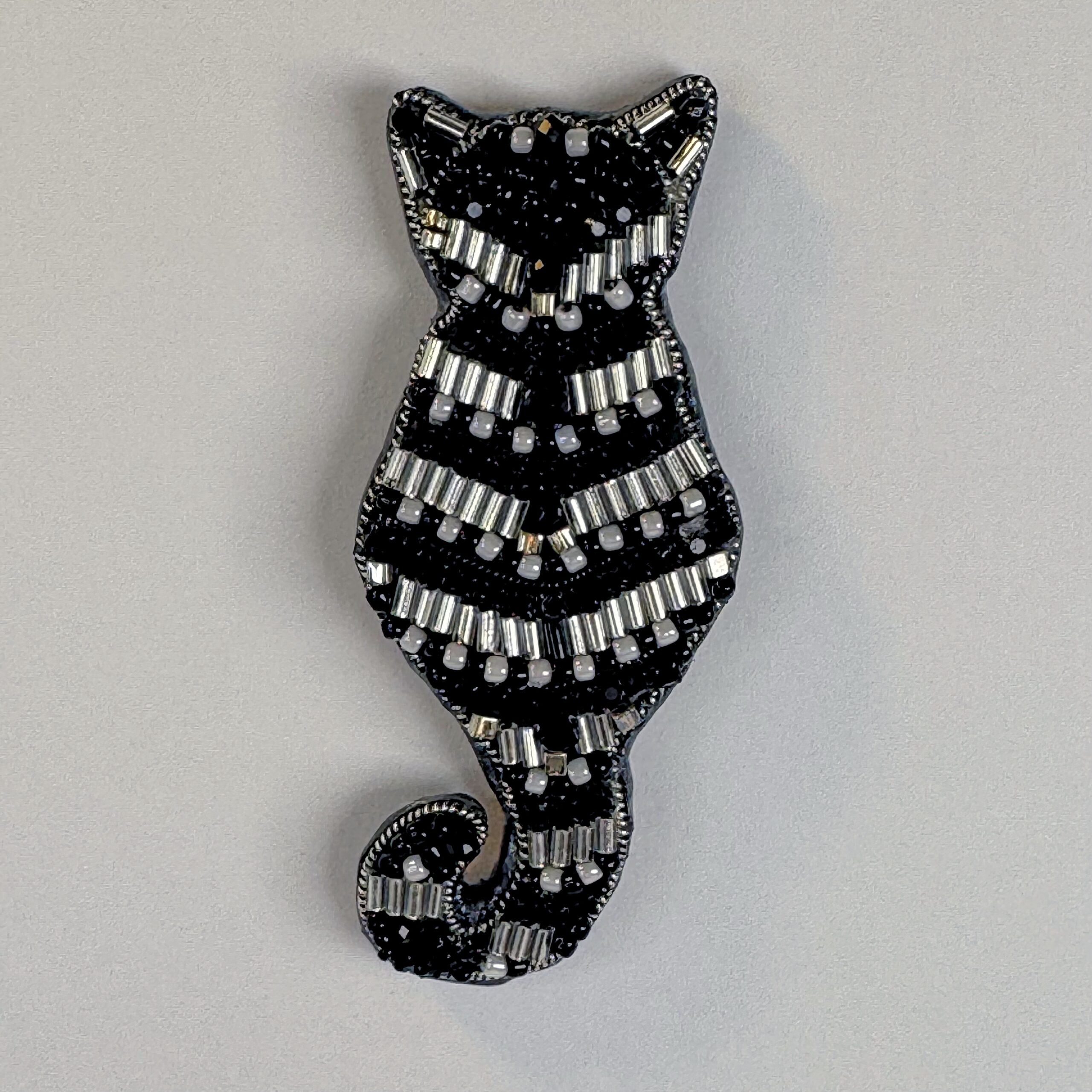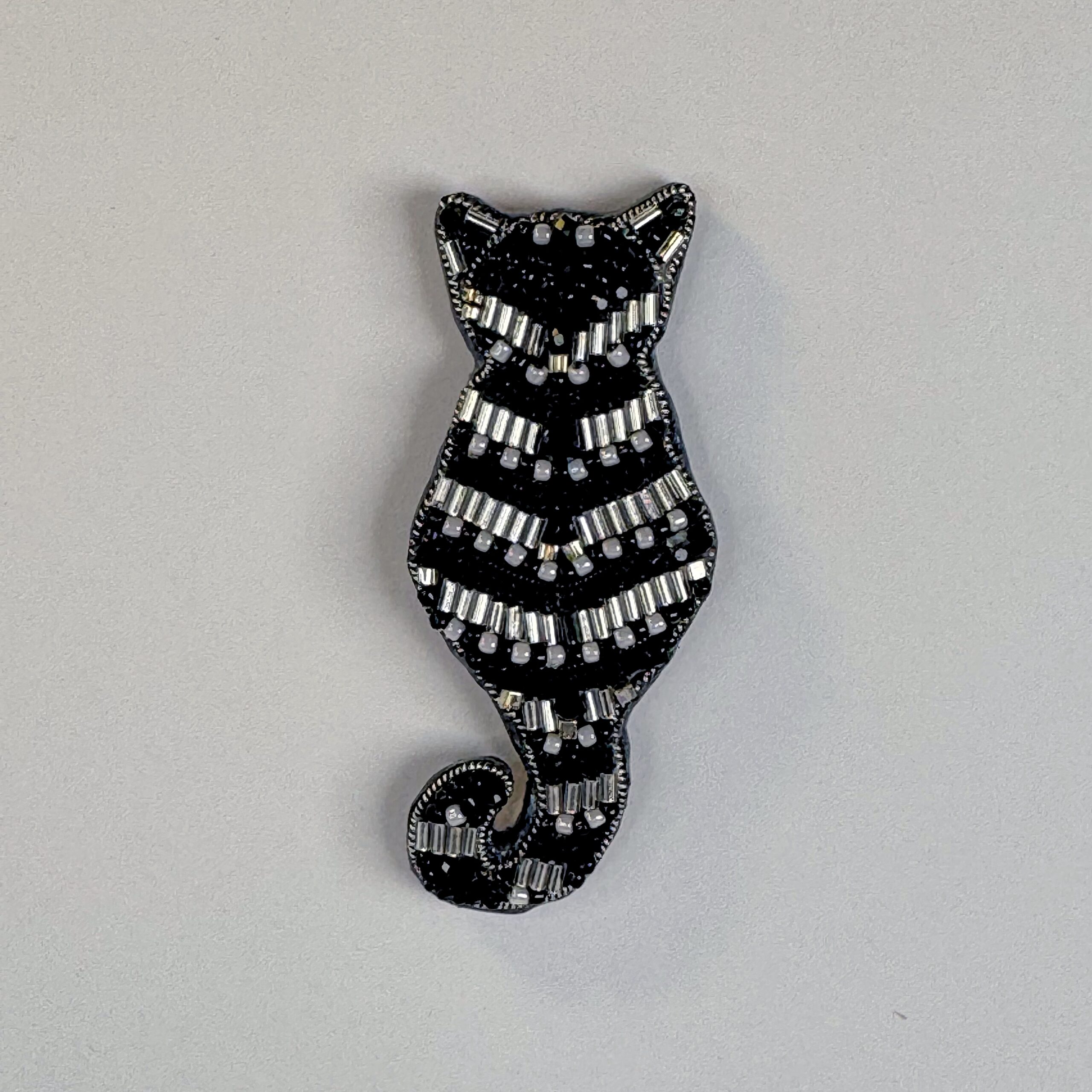 Sleek, tall, and unmistakably elegant — this handcrafted cat brooch captures a long-bodied feline in a graceful sitting pose viewed from behind. The entire silhouette is covered with alternating rows of jet-black seed beads and gleaming silver bugle beads, creating a striking striped coat that catches the light beautifully. Taller and more imposing than its smaller counterpart, this brooch makes a bold statement on any outfit.