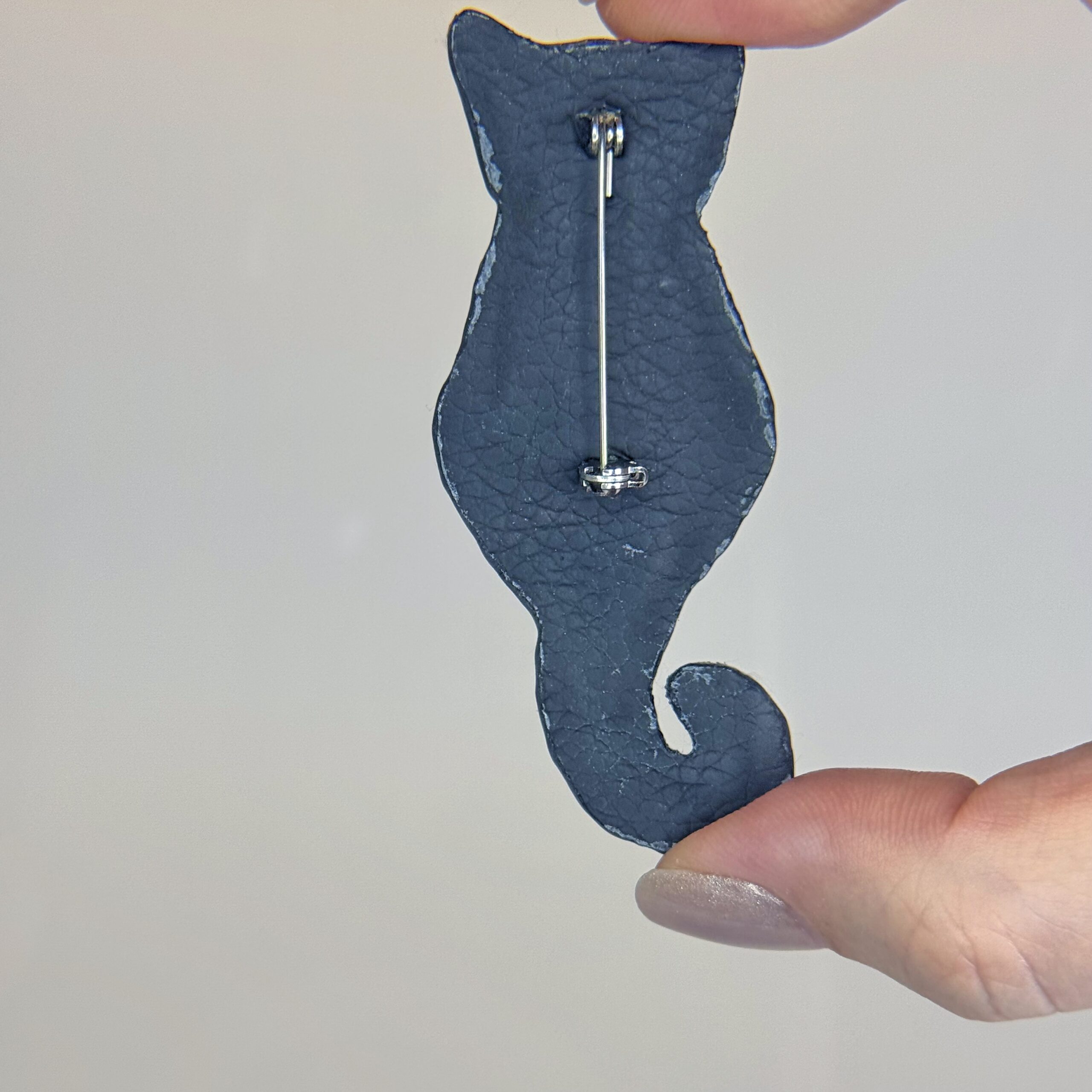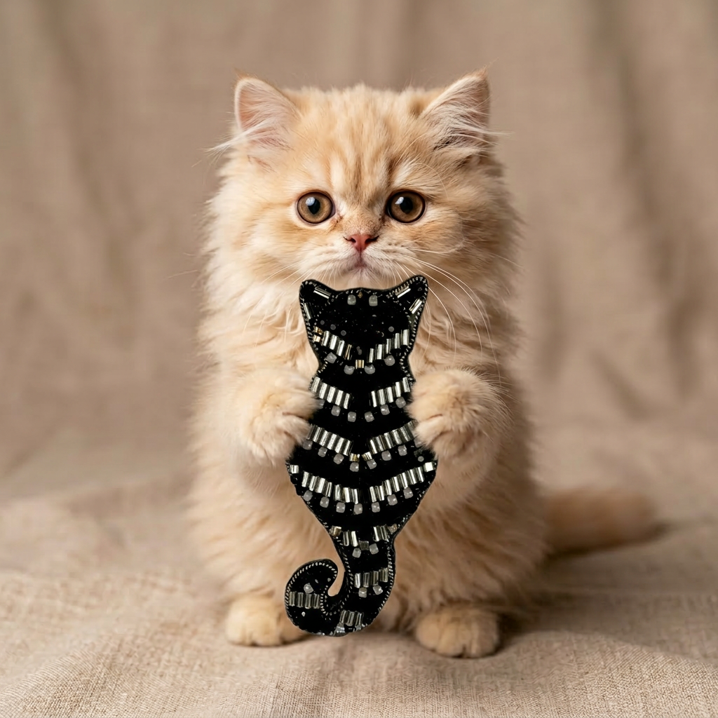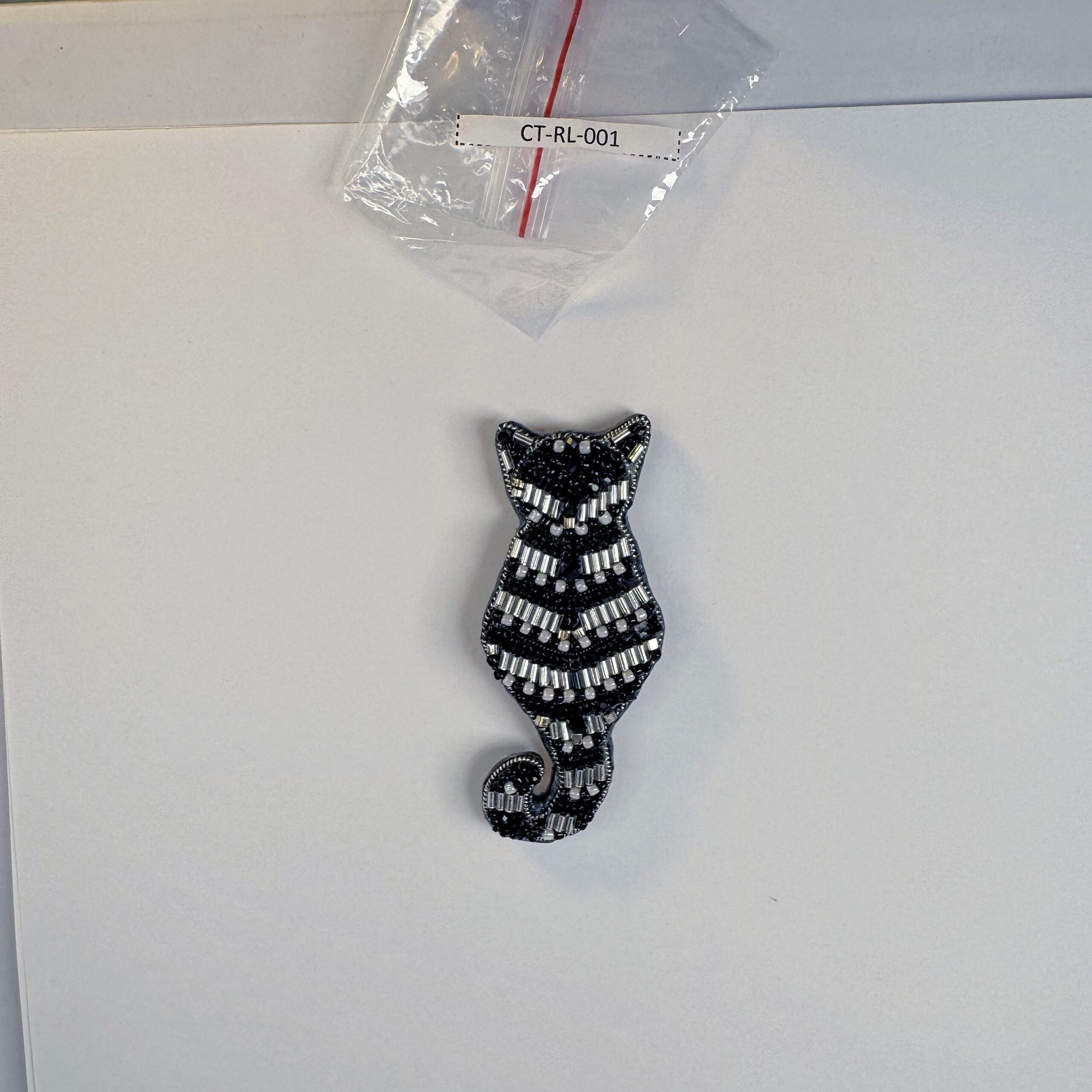Sleek, tall, and unmistakably elegant — this handcrafted cat brooch captures a long-bodied feline in a graceful sitting pose viewed from behind. The entire silhouette is covered with alternating rows of jet-black seed beads and gleaming silver bugle beads, creating a striking striped coat that catches the light beautifully. Taller and more imposing than its smaller counterpart, this brooch makes a bold statement on any outfit.