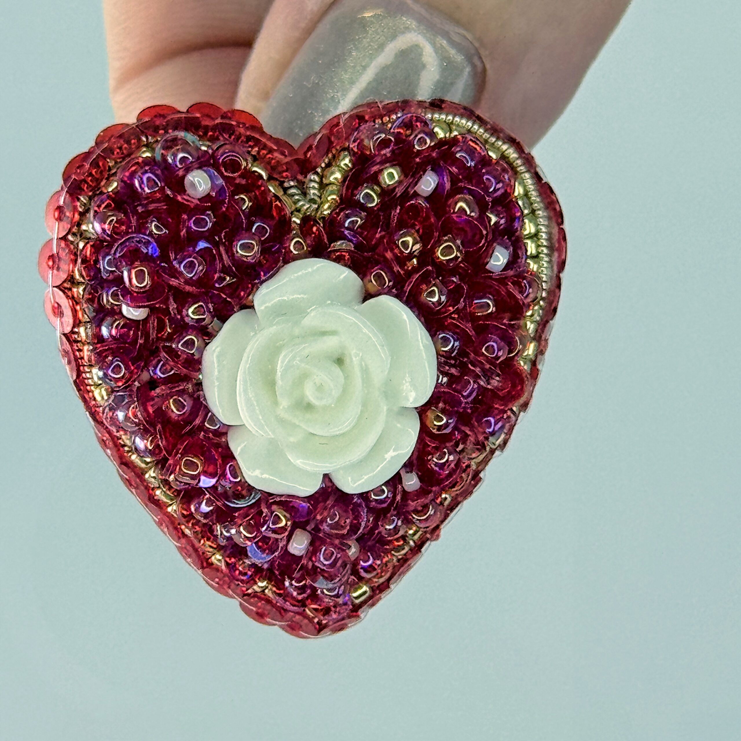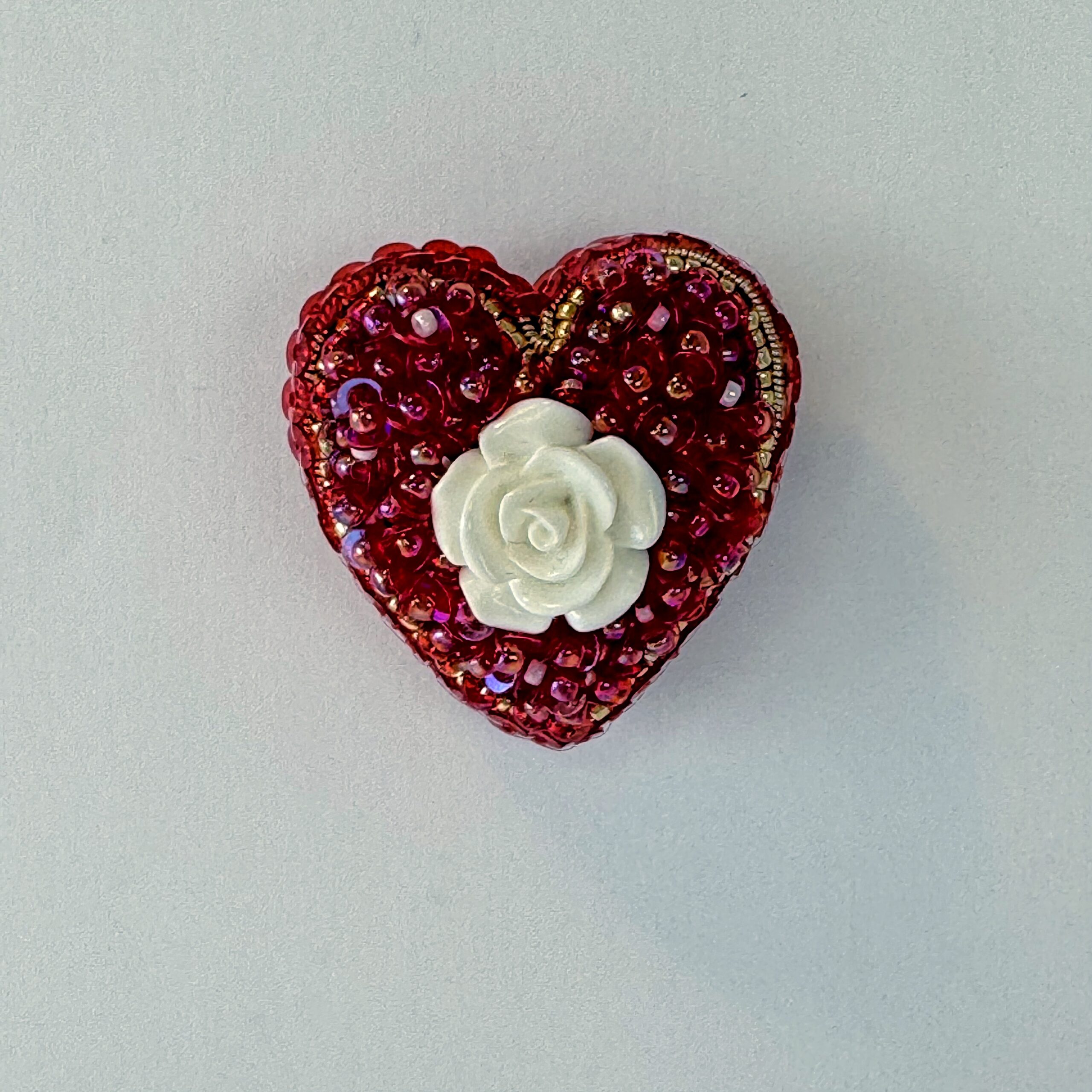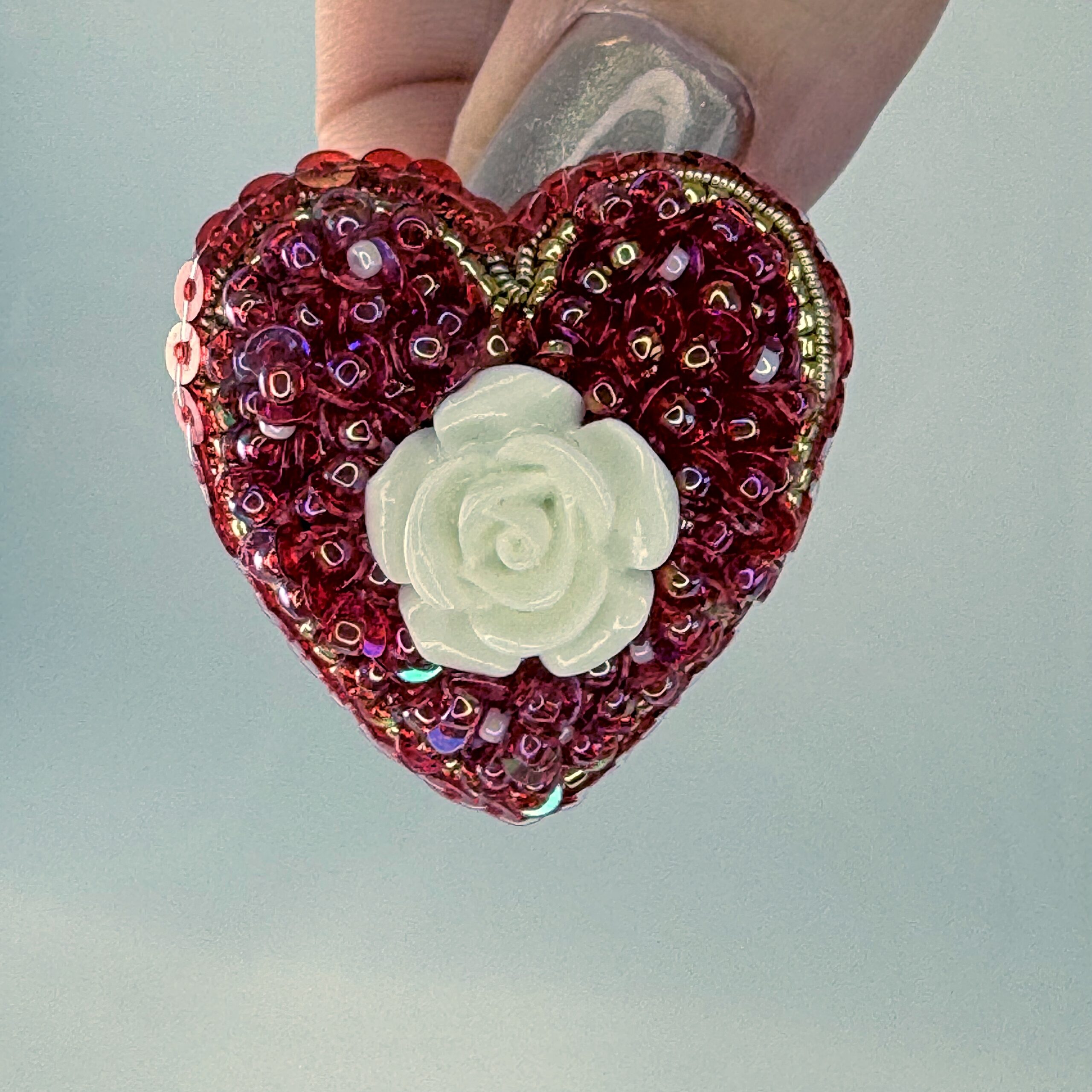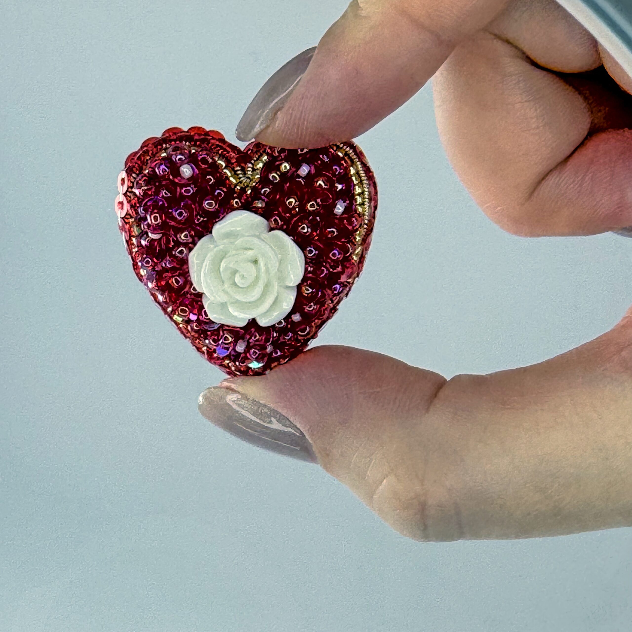 Sweet, compact, and bursting with romance — this petite red heart brooch is covered with vibrant red sequins that shimmer and ripple with movement. At the center, a delicate white rose cabochon adds a pure, romantic contrast to the passionate red. The perfect size for pinning to a collar, lapel, or bag strap without overwhelming the look — a charming everyday Valentine piece.