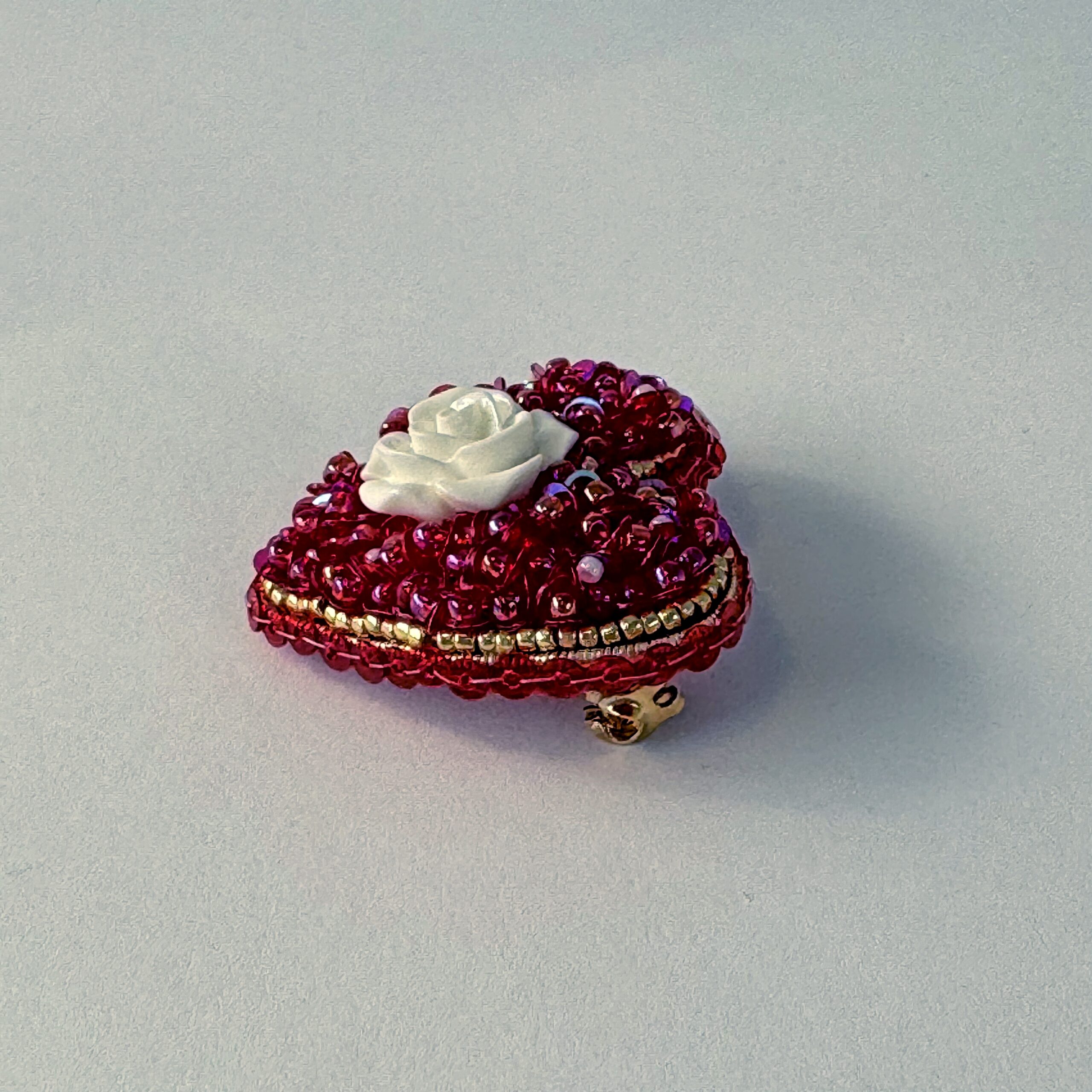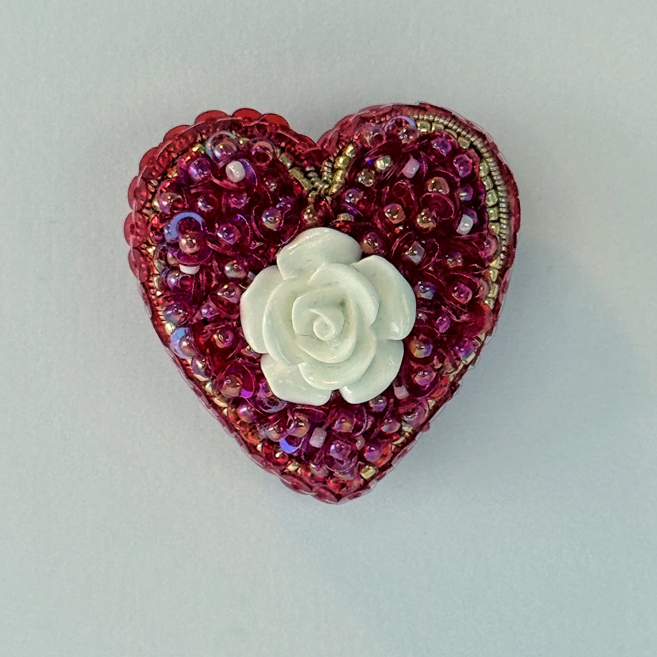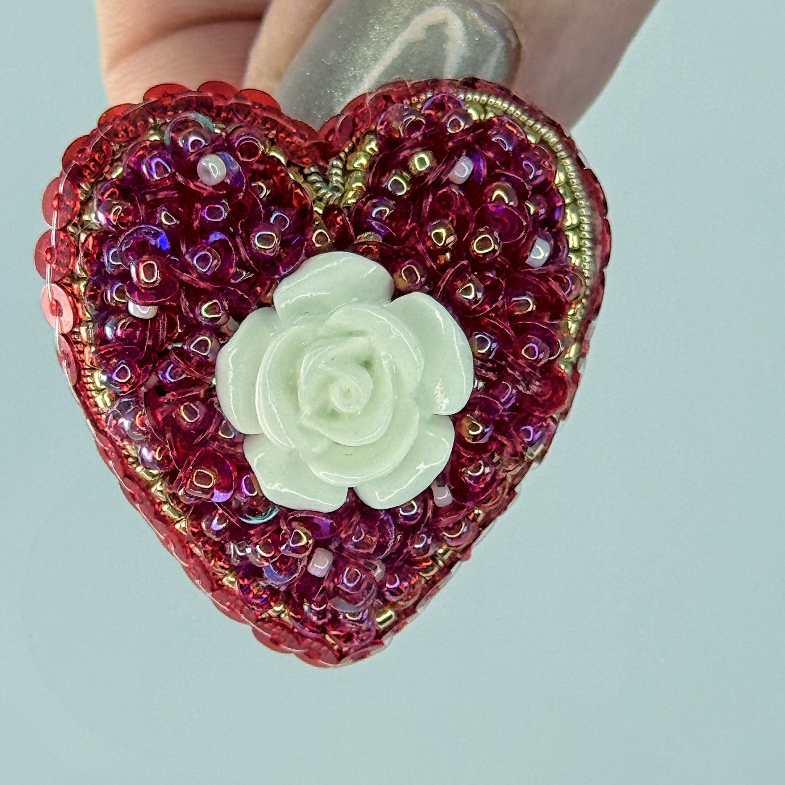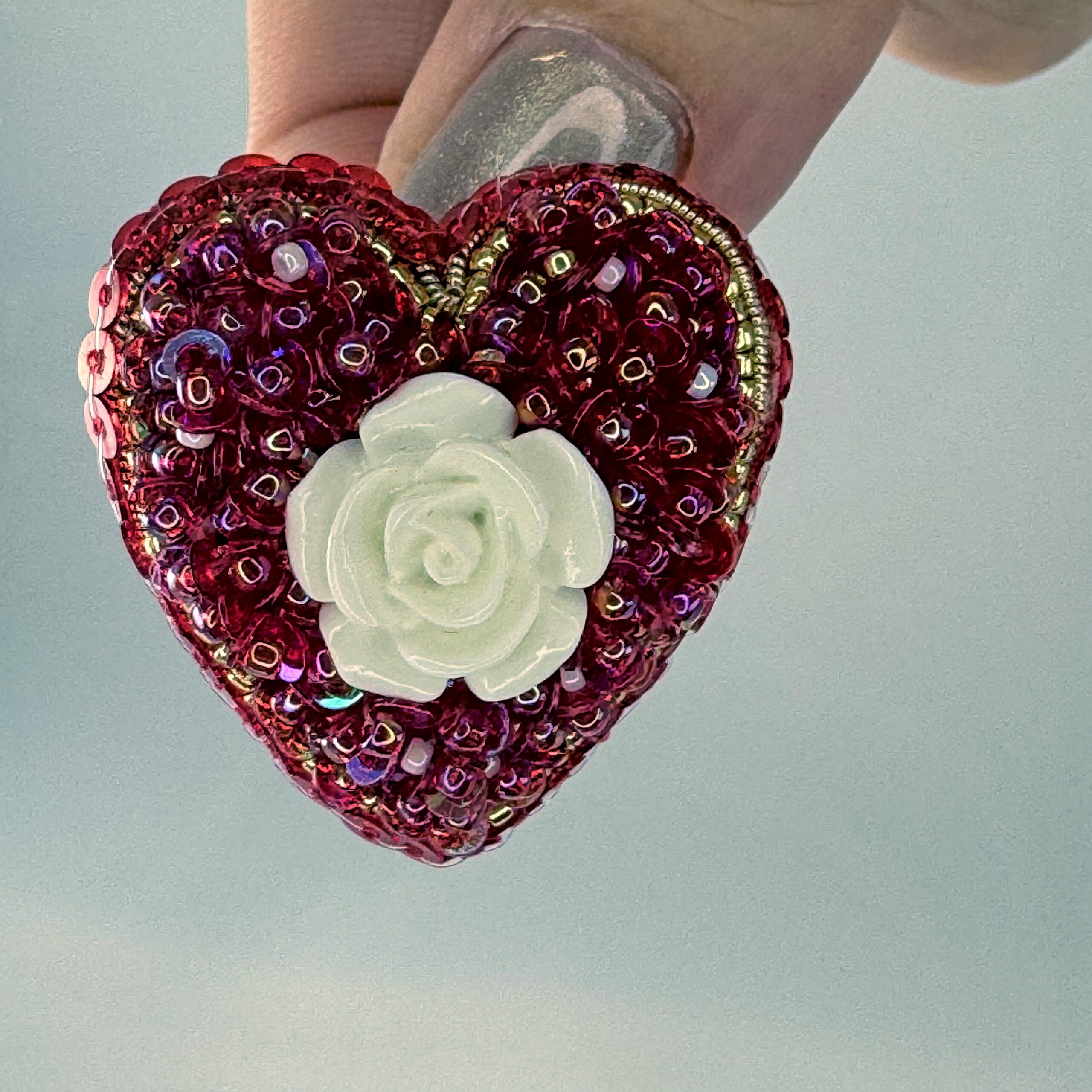 Sweet, compact, and bursting with romance — this petite red heart brooch is covered with vibrant red sequins that shimmer and ripple with movement. At the center, a delicate white rose cabochon adds a pure, romantic contrast to the passionate red. The perfect size for pinning to a collar, lapel, or bag strap without overwhelming the look — a charming everyday Valentine piece.