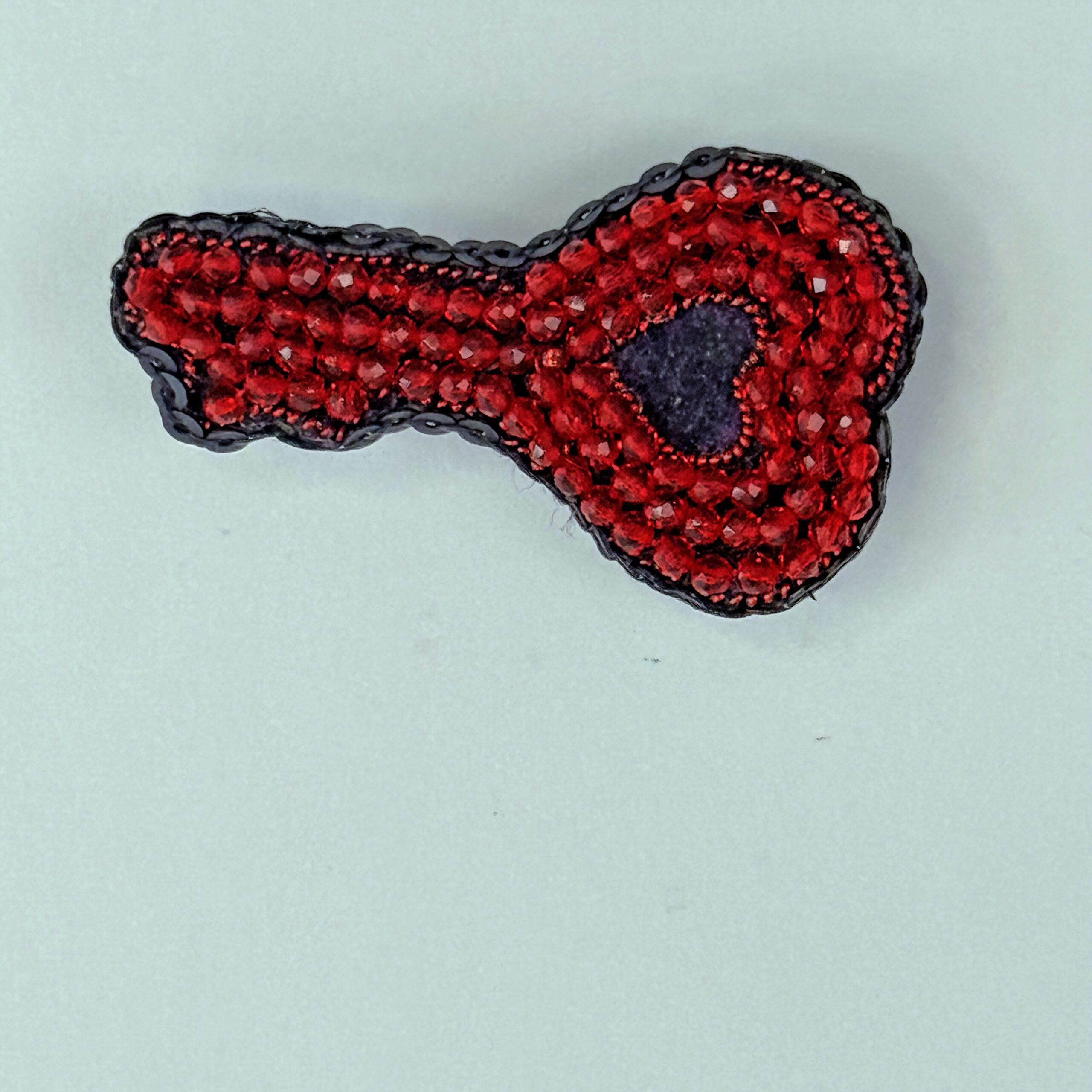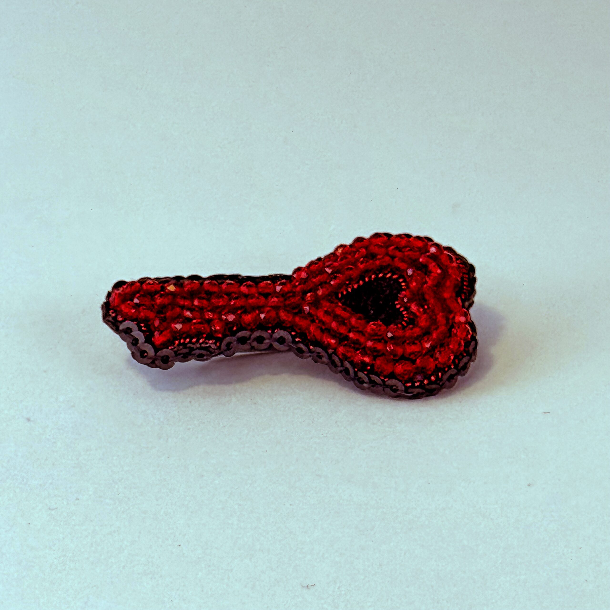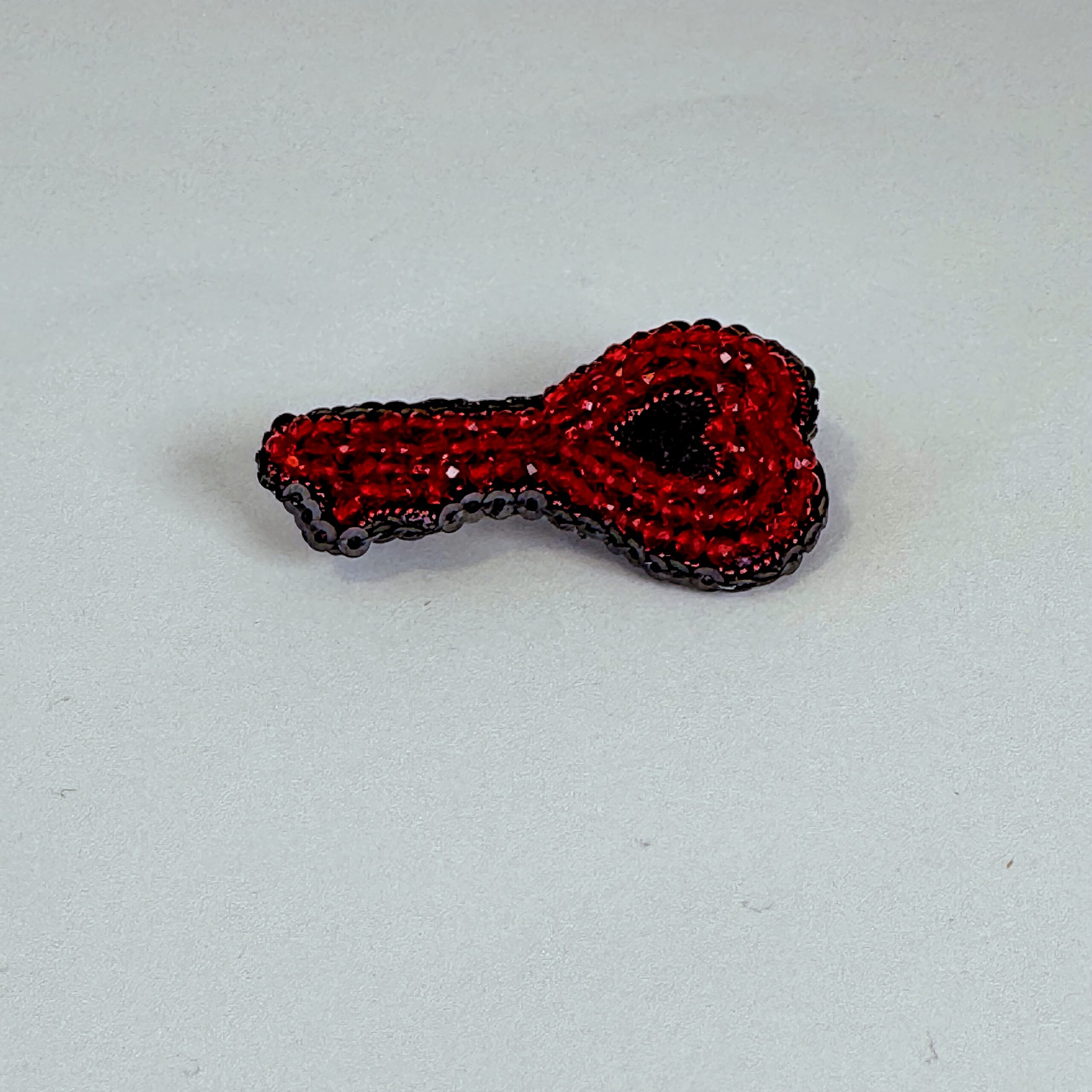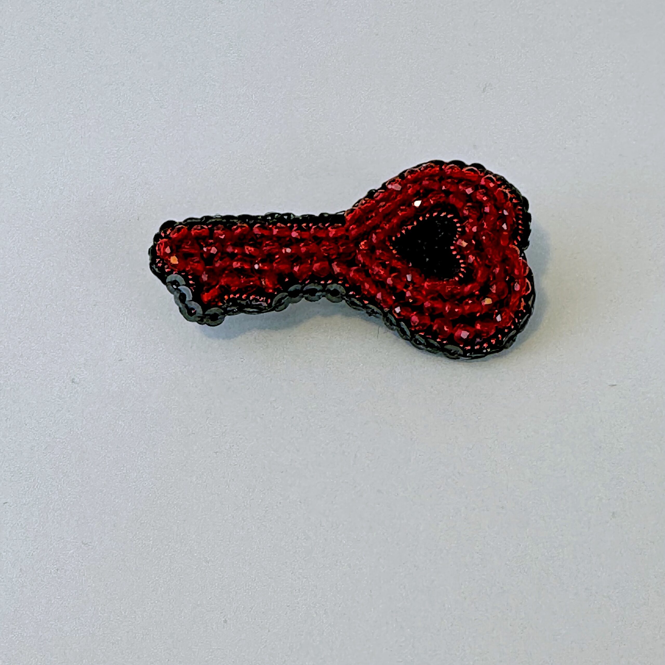 Unlock hearts with this extraordinary handcrafted heart-key brooch — a unique design that merges the classic key shape with the universal language of love. The entire surface is densely covered with deep red faceted glass beads that create a rich, jewel-like texture. A small black heart sits at the center as a dramatic focal point, while a black bead outline defines the key's elegant silhouette with crisp precision. A truly one-of-a-kind piece that will never fail to draw compliments.