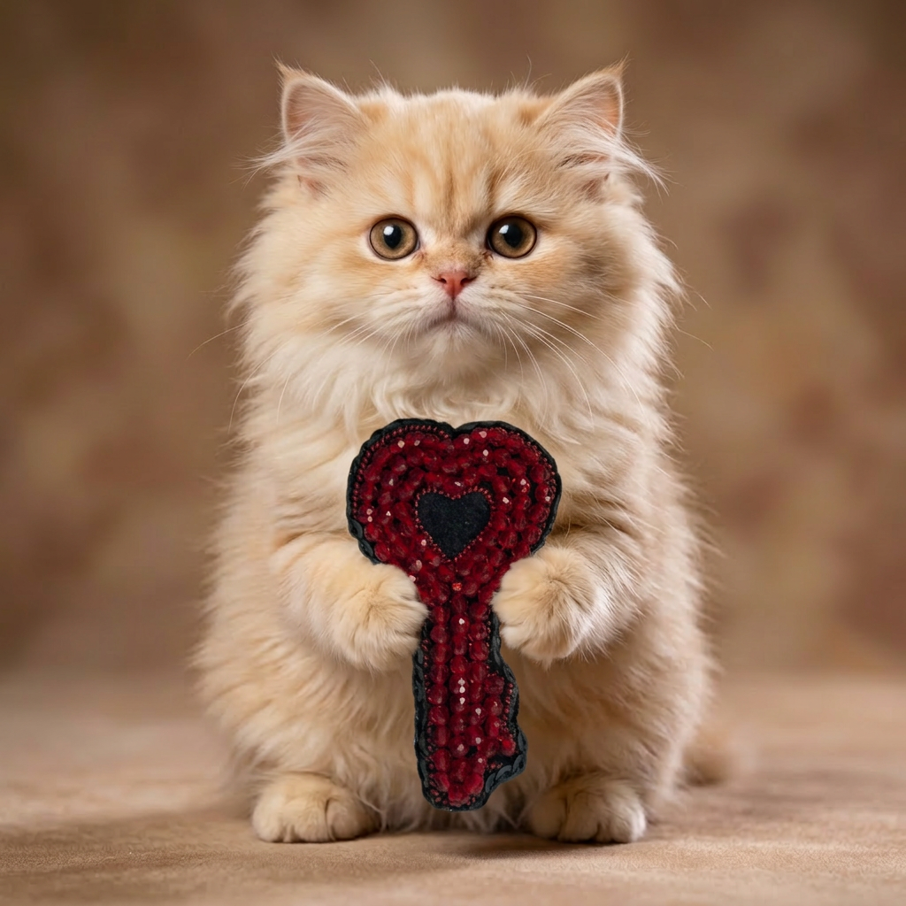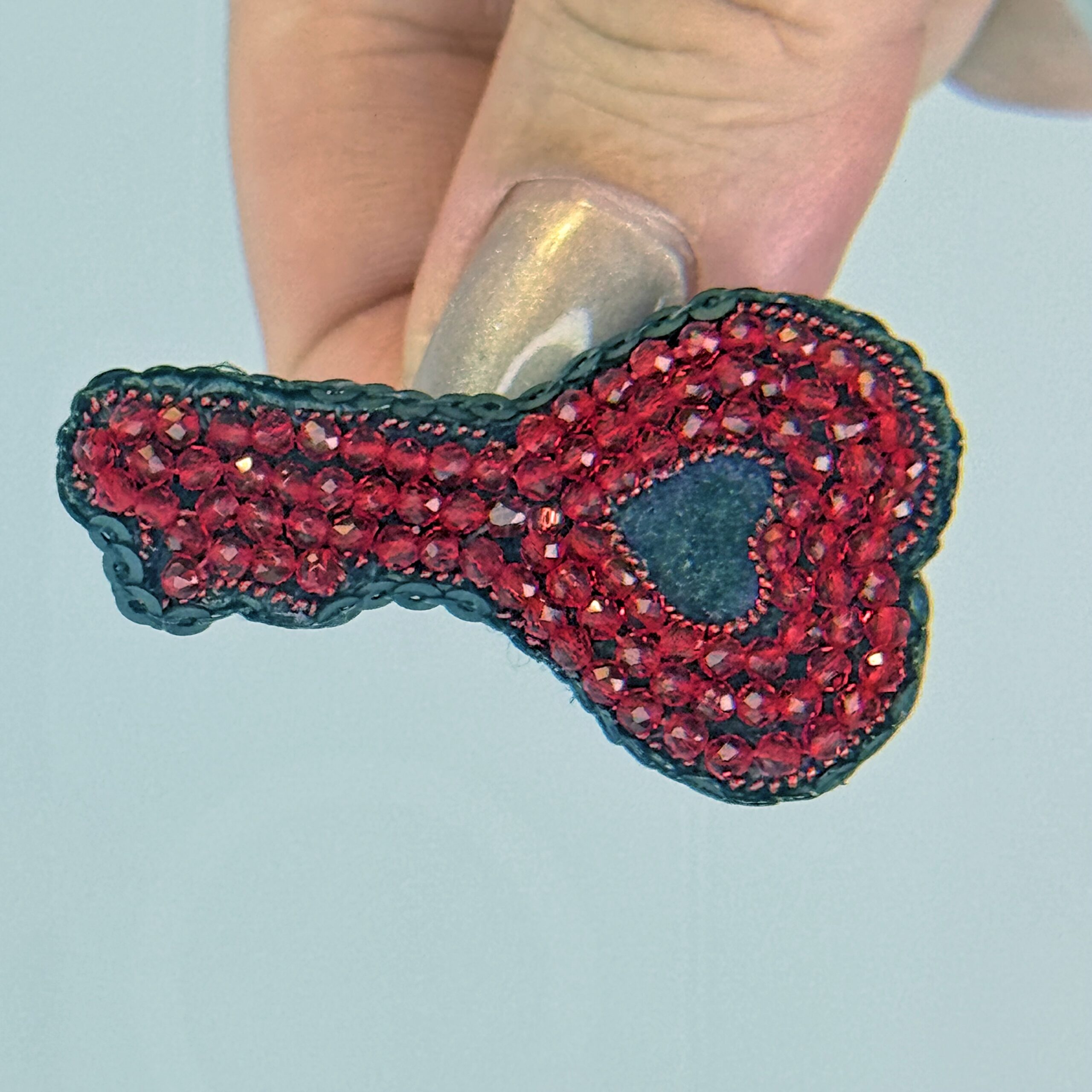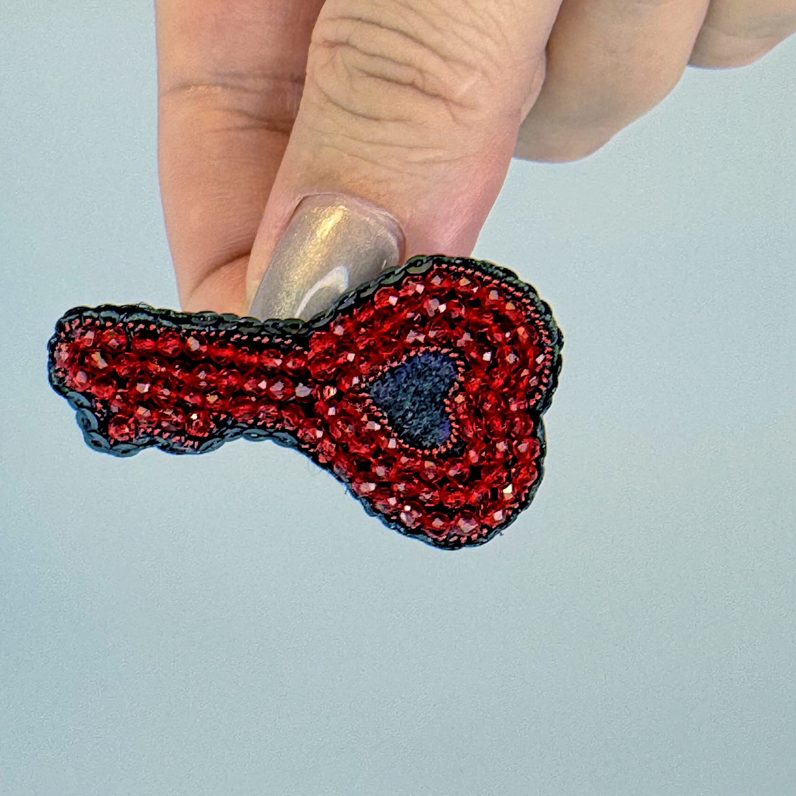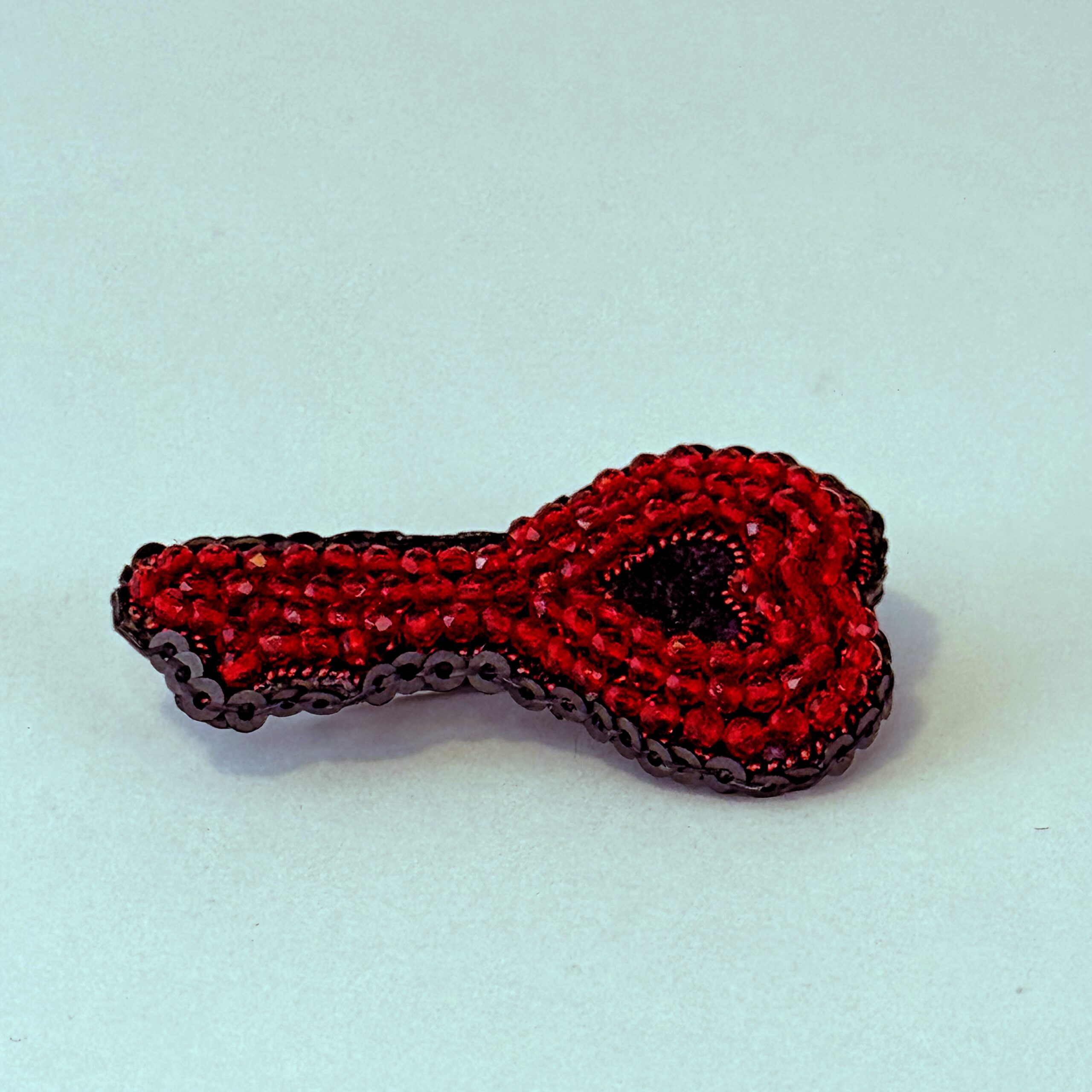 Unlock hearts with this extraordinary handcrafted heart-key brooch — a unique design that merges the classic key shape with the universal language of love. The entire surface is densely covered with deep red faceted glass beads that create a rich, jewel-like texture. A small black heart sits at the center as a dramatic focal point, while a black bead outline defines the key's elegant silhouette with crisp precision. A truly one-of-a-kind piece that will never fail to draw compliments.