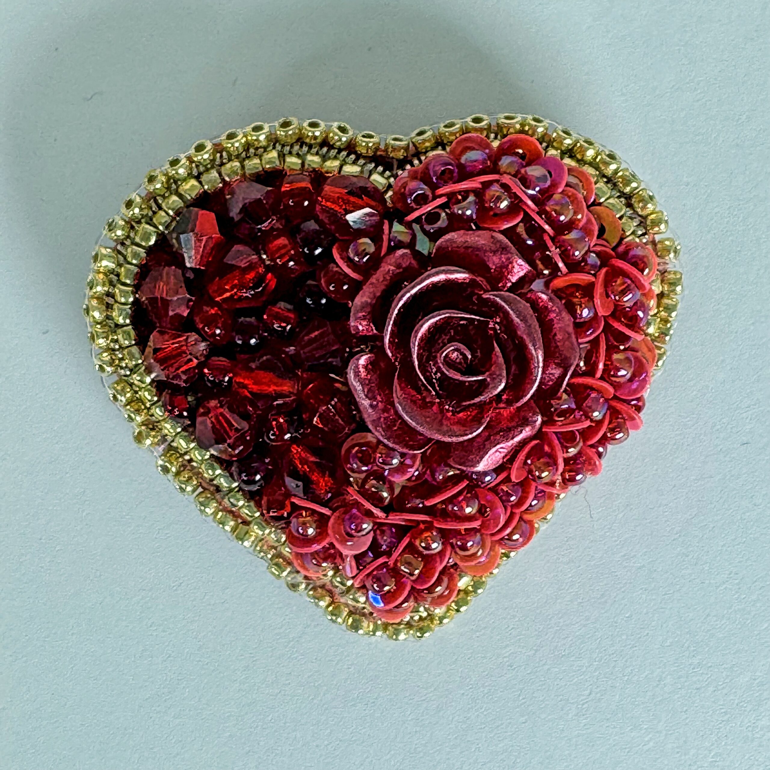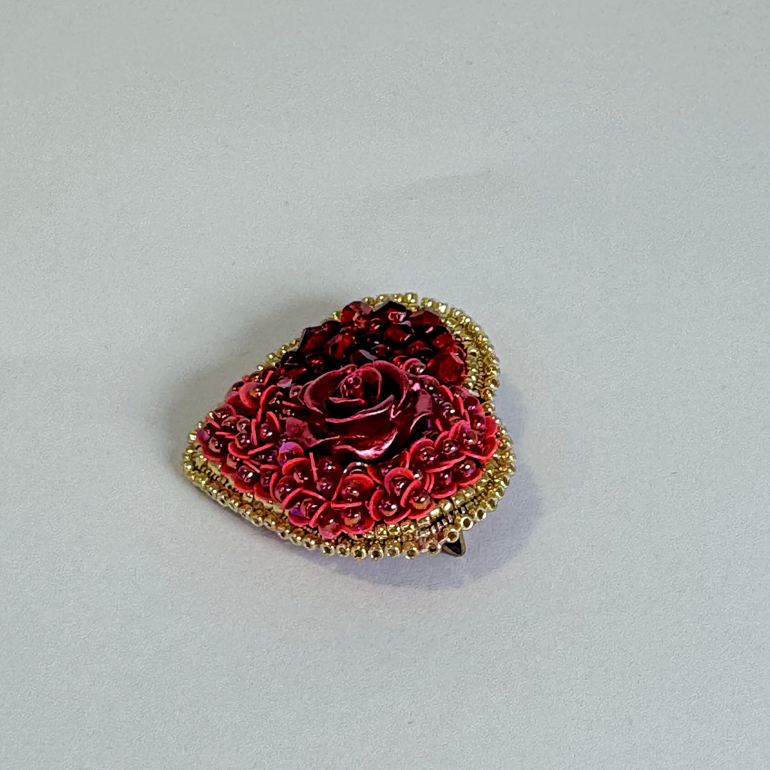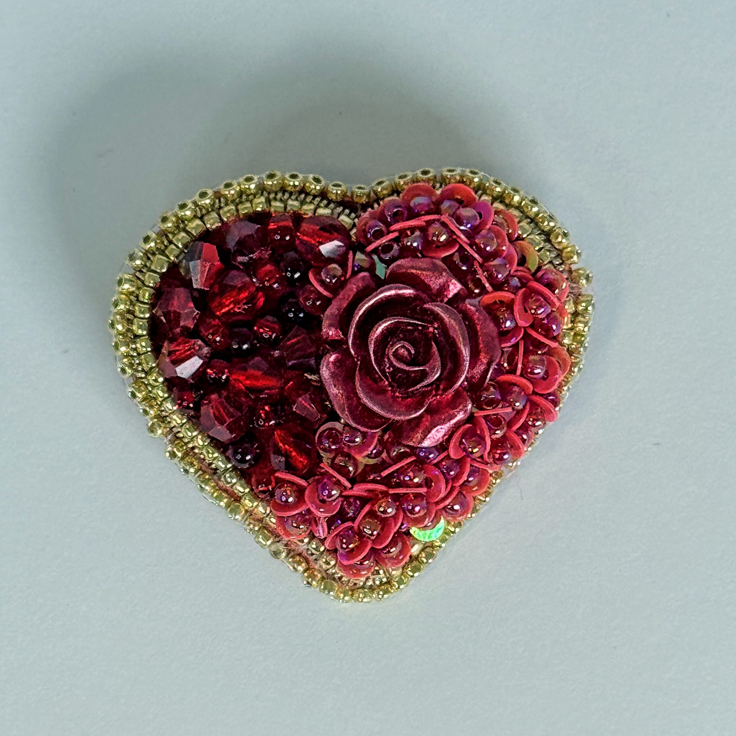 Drama, passion, and romance embodied in one extraordinary brooch — a large, three-dimensional red rose cabochon dominates the center of this deep red heart, surrounded by layers of shimmering red sequins that ripple across the surface. A border of warm gold seed beads frames the heart with golden luxury.