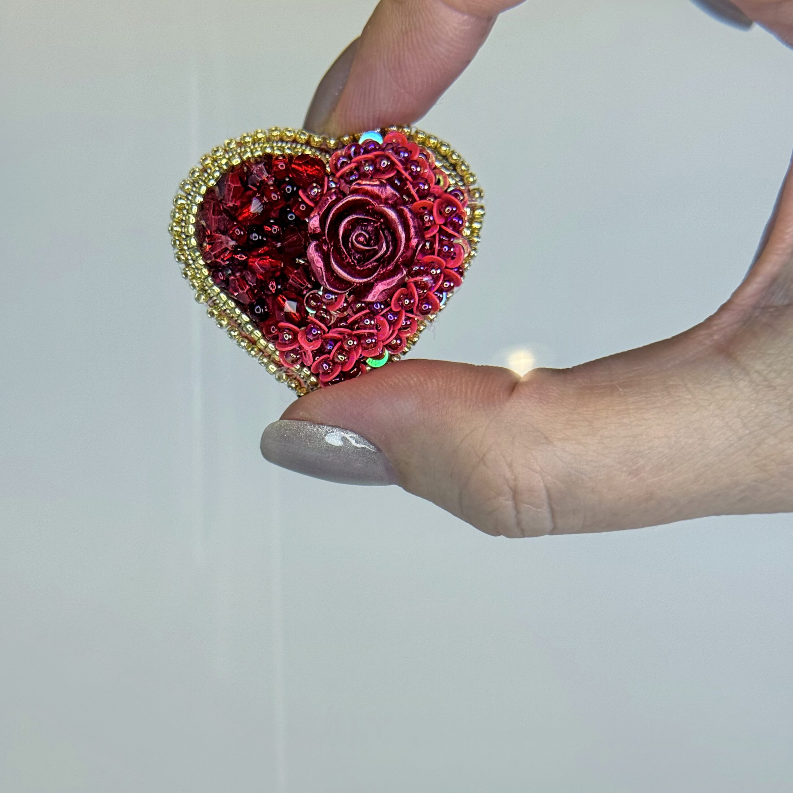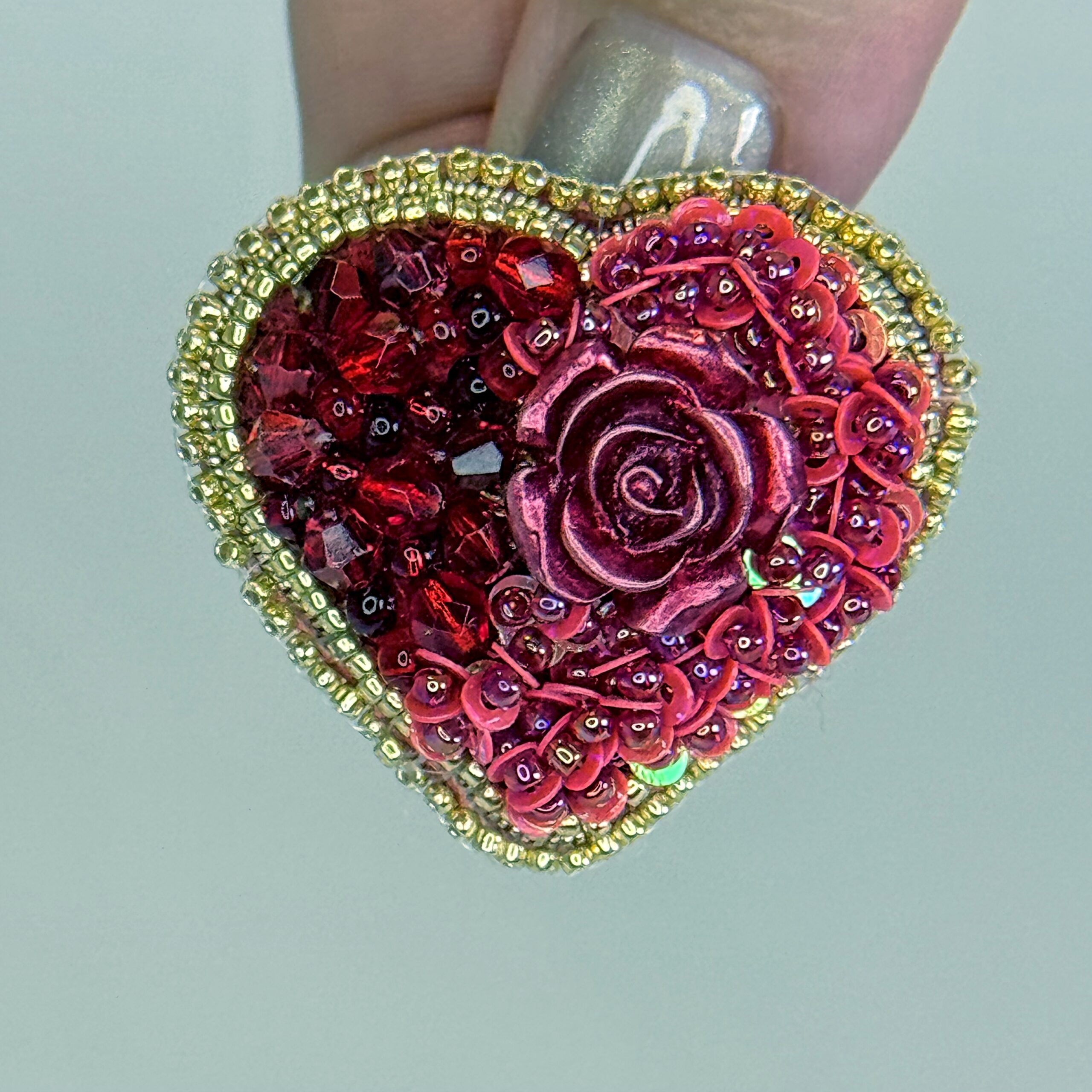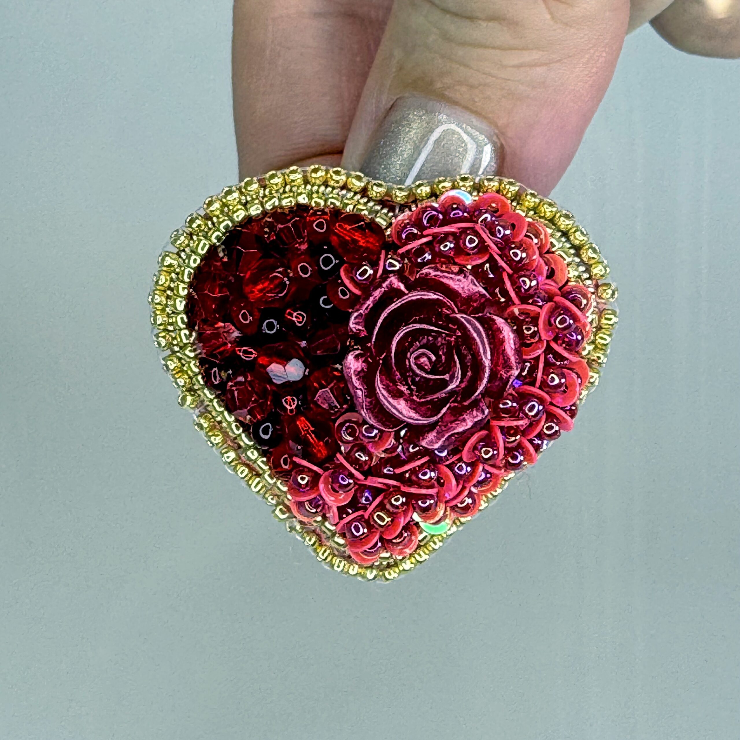 Drama, passion, and romance embodied in one extraordinary brooch — a large, three-dimensional red rose cabochon dominates the center of this deep red heart, surrounded by layers of shimmering red sequins that ripple across the surface. A border of warm gold seed beads frames the heart with golden luxury.