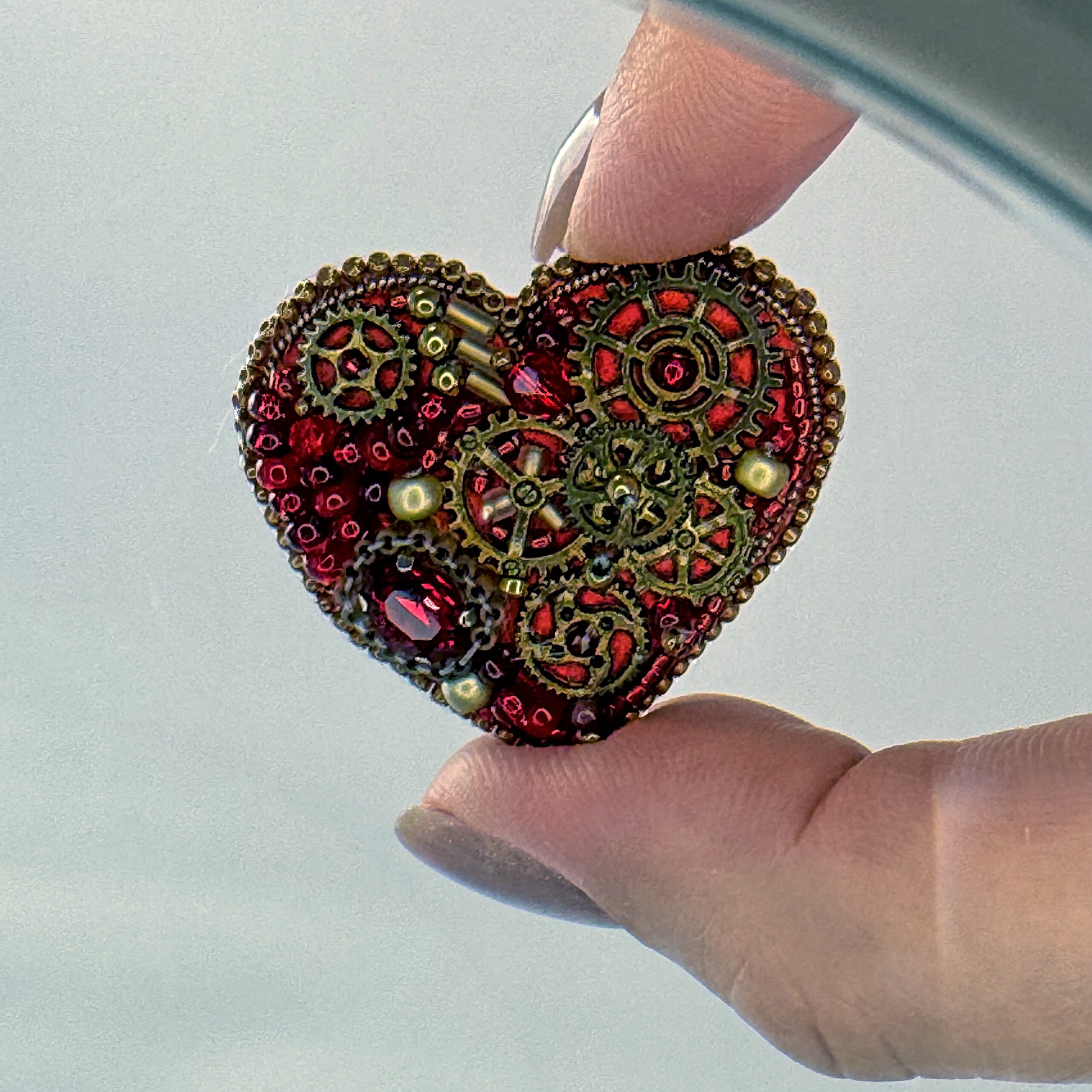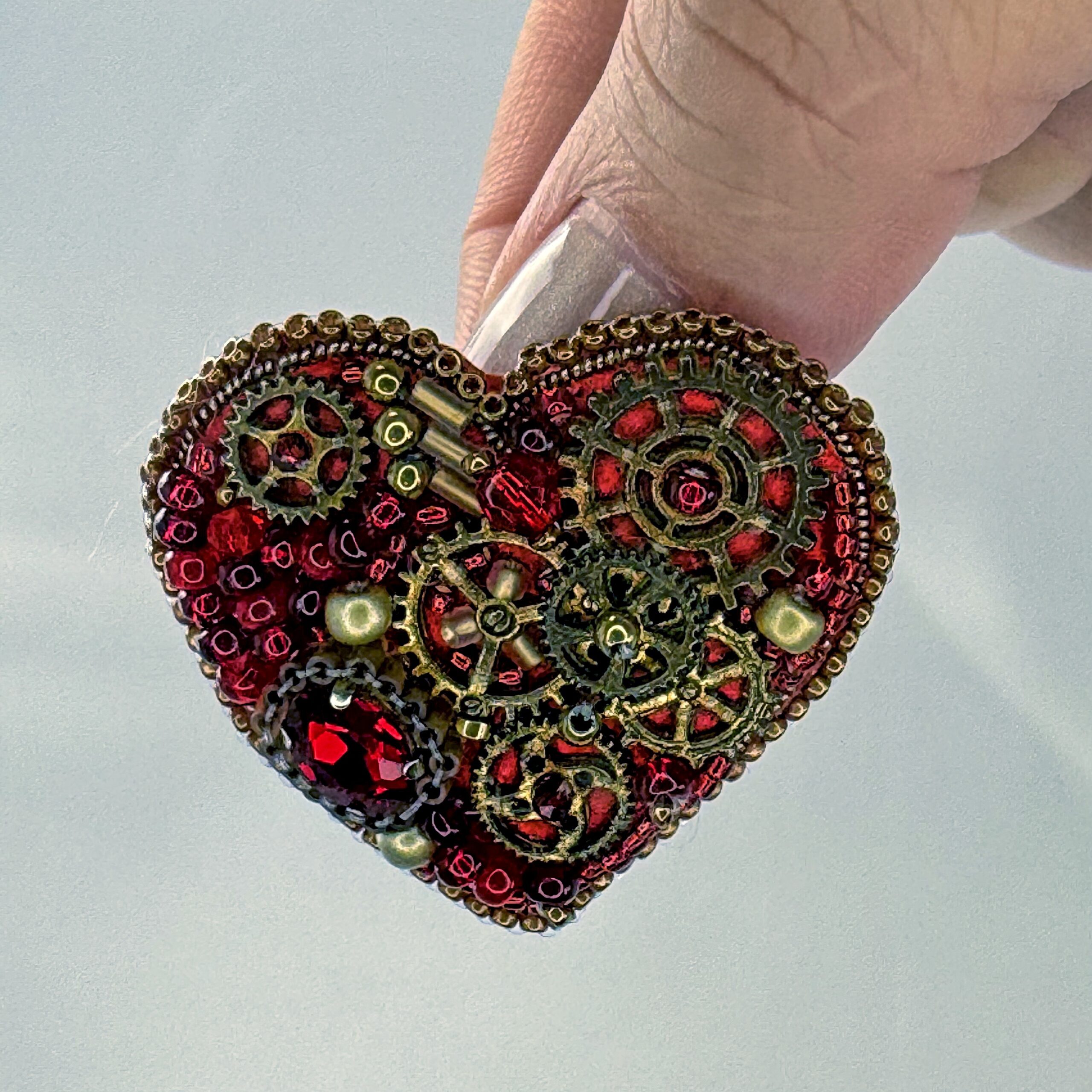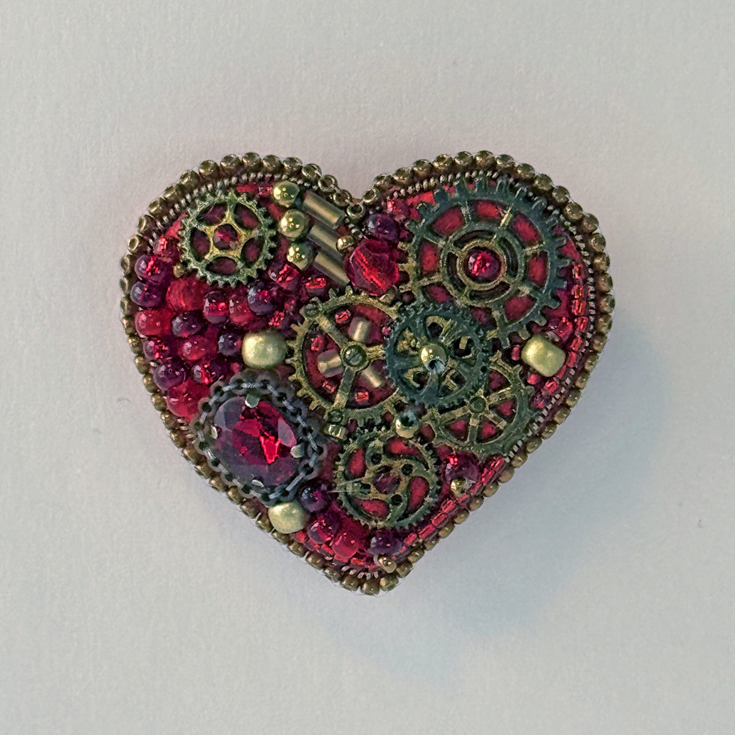 A bold mechanical heart for the boldest of romantics — this steampunk brooch features prominent bronze gears arranged in a clean, dramatic composition at the heart's center. The surrounding surface is filled with deep red glass beads, creating a rich crimson backdrop that makes the bronze clockwork machinery pop with industrial elegance. A cleaner, more focused gear arrangement than its counterpart makes this piece particularly striking and architecturally refined.