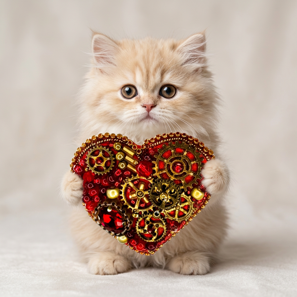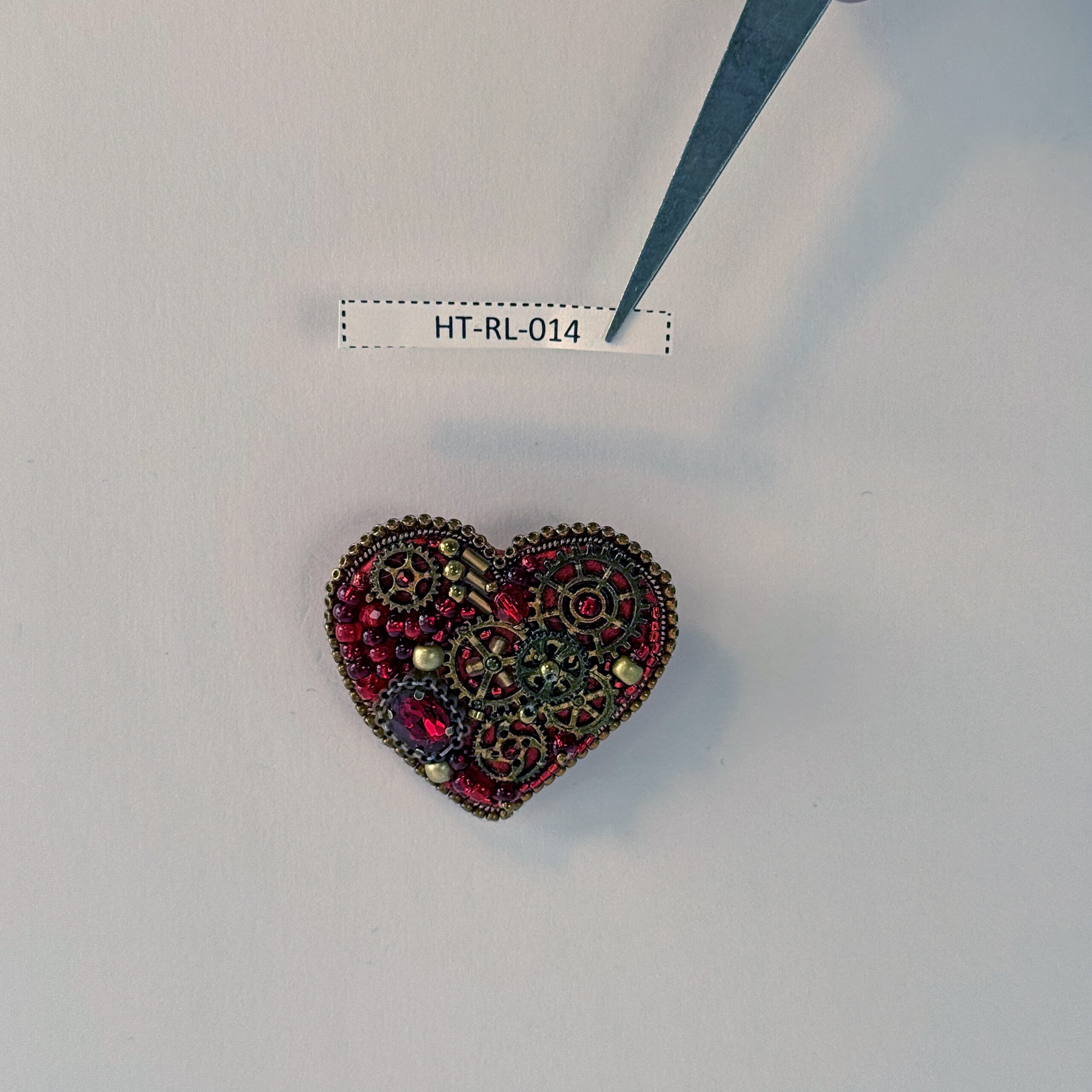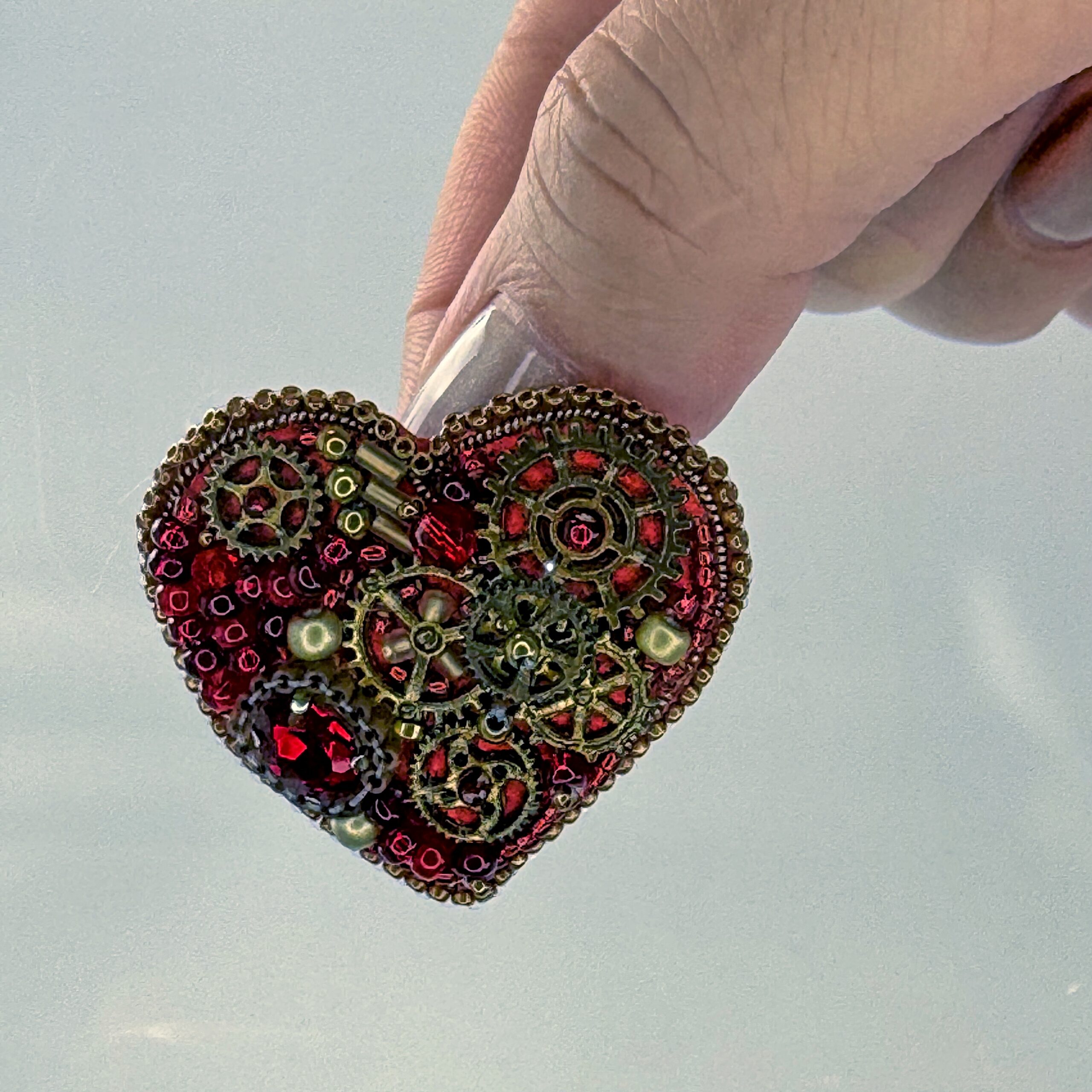 A bold mechanical heart for the boldest of romantics — this steampunk brooch features prominent bronze gears arranged in a clean, dramatic composition at the heart's center. The surrounding surface is filled with deep red glass beads, creating a rich crimson backdrop that makes the bronze clockwork machinery pop with industrial elegance. A cleaner, more focused gear arrangement than its counterpart makes this piece particularly striking and architecturally refined.