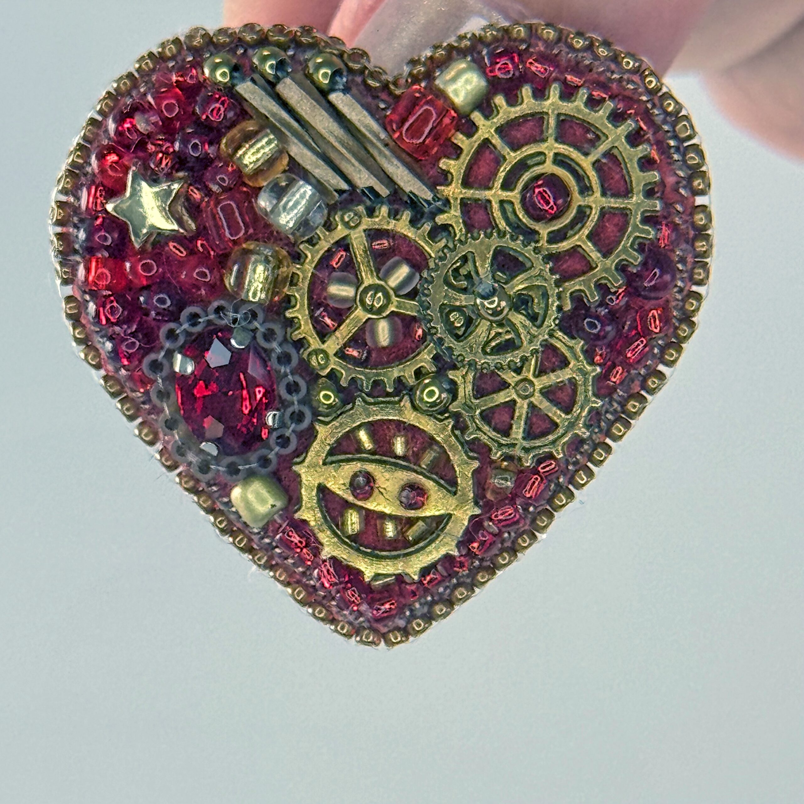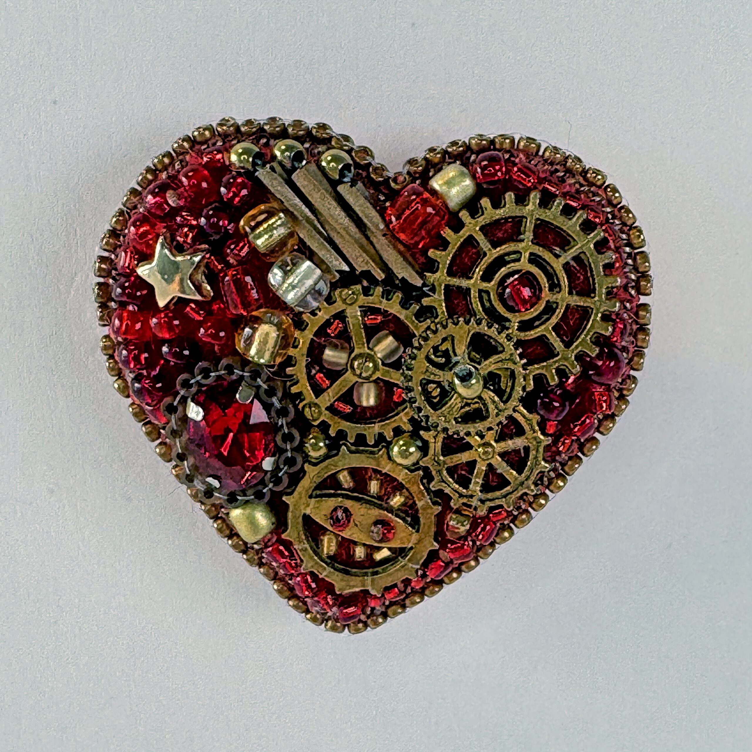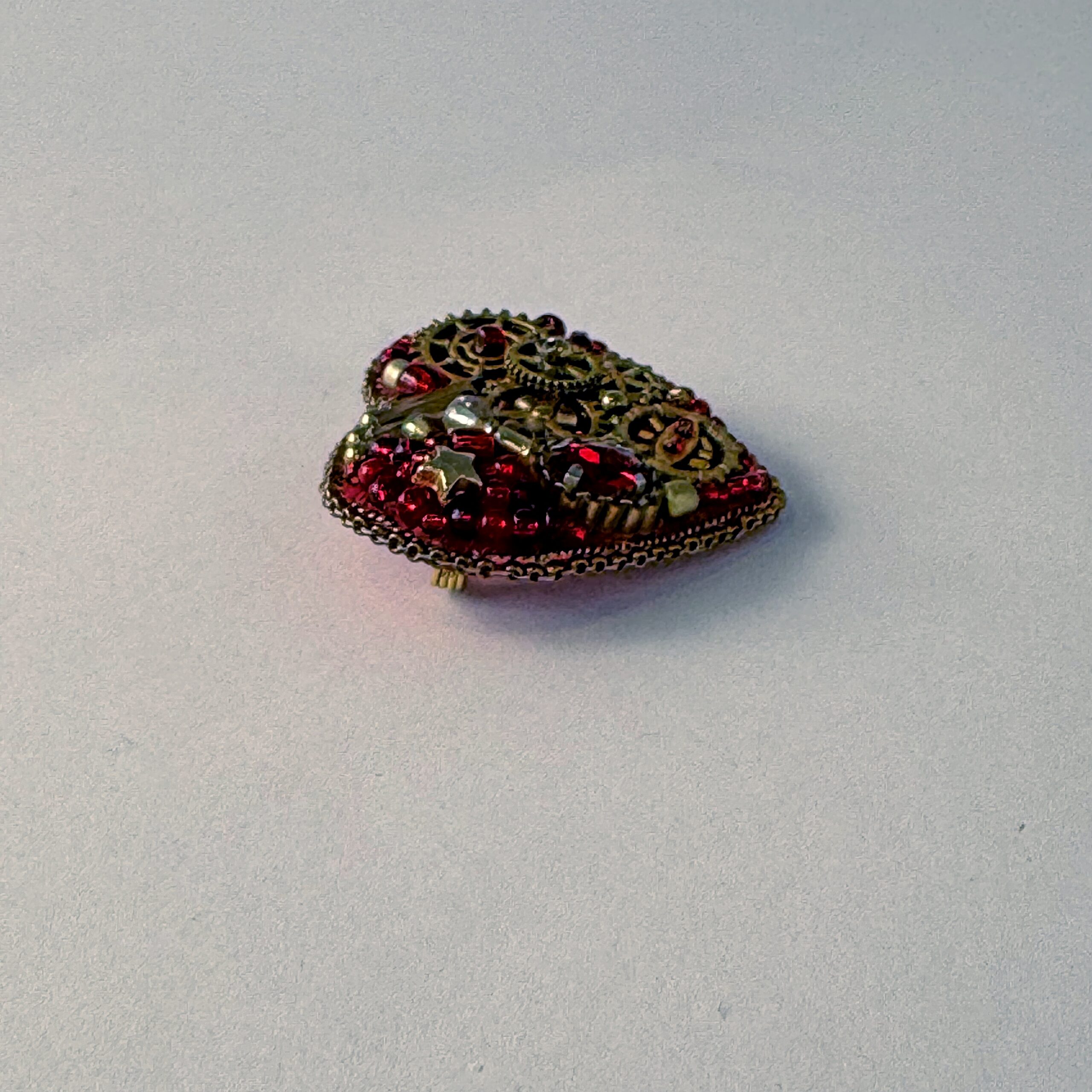 The most gem-accented of the steampunk hearts — this red mechanical heart combines bronze clock gears with a sparkling red faceted crystal, gold star beads, and red bugle bead background. The crystal adds a precious, sparkling dimension to the industrial gear composition, bridging the gap between Victorian clockwork and fine jewelry aesthetics. A complex and layered piece that rewards close inspection.