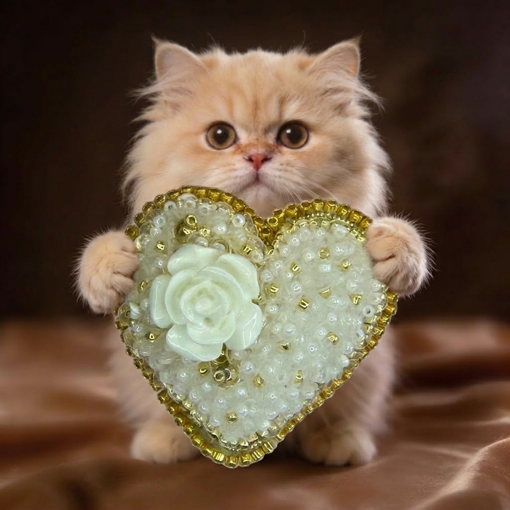 Refined, elegant, and utterly romantic — this white and gold heart brooch presents a classic white rose cabochon at its center, surrounded by lustrous white glass beads and framed by a warm gold border. The considered balance of bead coverage and the warmth of the gold edge creates a piece of quiet luxury — a brooch for the woman who appreciates understated beauty. Equally at home on a bridal gown as on a everyday blazer.